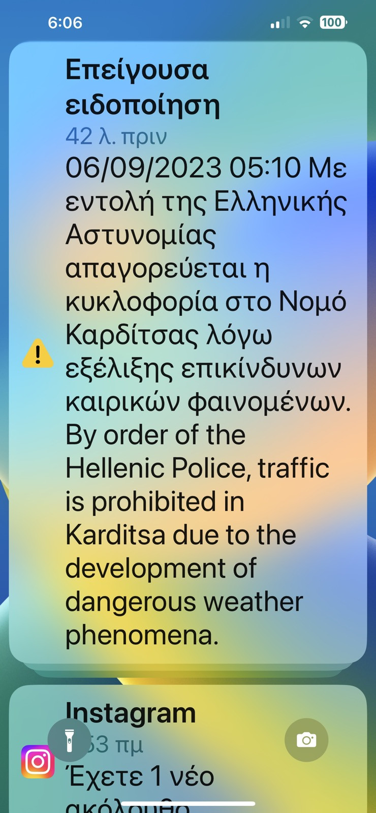 Η Πολιτική Προστασία έστειλε χθες δεύτερο μήνυμα μέσω του 112 στους κατοίκους της περιοχής, προκειμένου να υπενθυμίσει την απαγόρευση κυκλοφορίας. Οι ζημιές από το μέχρι στιγμής πέρασμα της κακοκαιρίας Daniel είναι ανυπολόγιστες, ωστόσο προέχει η ανθρώπινη ζωή και αυτό ακριβώς θέλουν να εξασφαλίσουν οι αρχές.