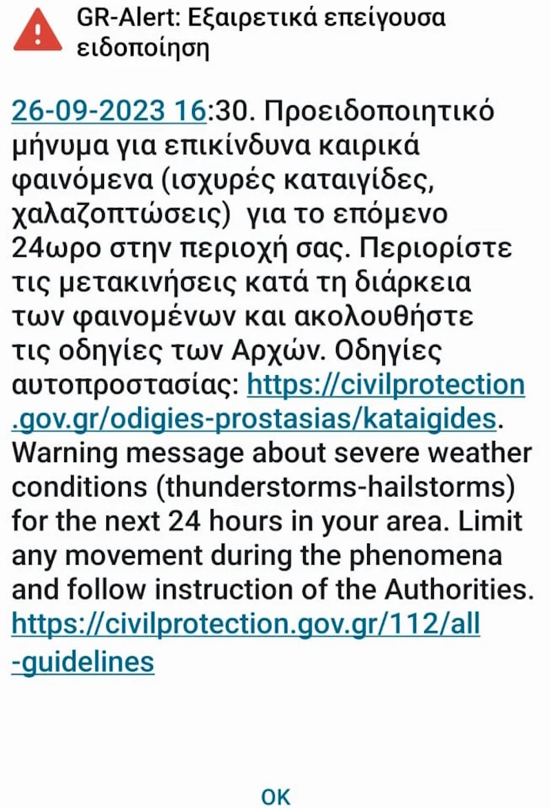 Συγκεκριμένα, μηνύματα από το 112 έχουν λάβει – από τη Δευτέρα (25/09) – οι κάτοικοι σε Φθιώτιδα, Θεσσαλία, Σποράδες, Εύβοια καθώς, και την Τρίτη (26/09), η Αττική, η Αχαΐα, η Κεφαλονιά, η Ζάκυνθος και η Ιθάκη. Ανάλογη ειδοποίηση έλαβαν, επίσης, και οι κάτοικοι σε πολλές περιοχές της Πελοποννήσου. «Προειδοποιητικό μήνυμα για επικίνδυνα καιρικά φαινόμενα (ισχυρές καταιγίδες, χαλαζοπτώσεις) για το επόμενο 24ωρο στην περιοχή σας, περιορίστε τις μετακινήσεις σας κατά τη διάρκεια των φαινομένων και ακολουθήστε τις οδηγίες των Αρχών» έγραφε το σχετικό μήνυμα του 112.