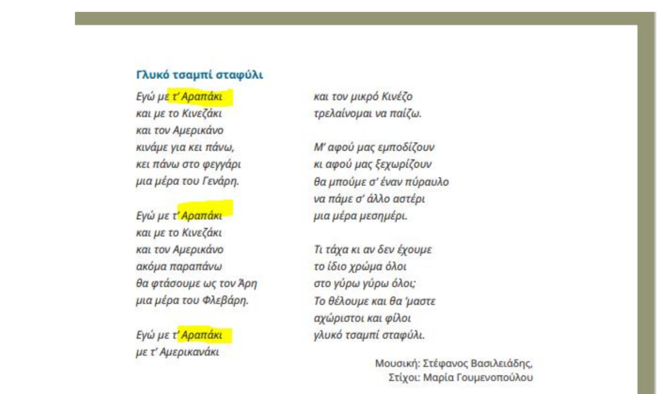 Μπορούν λέξεις όπως «έγχρωμος», «νεγράκι», «αραπάκι» να έχουν θέση στα σχολικά βιβλία, όταν όλα τα παιδιά έχουν δικαίωμα σε μια διαπολιτισμική εκπαιδευτική διαδικασία που σέβεται και τιμά τη διαφορετικότητα μέσα στις σχολικές τάξεις;