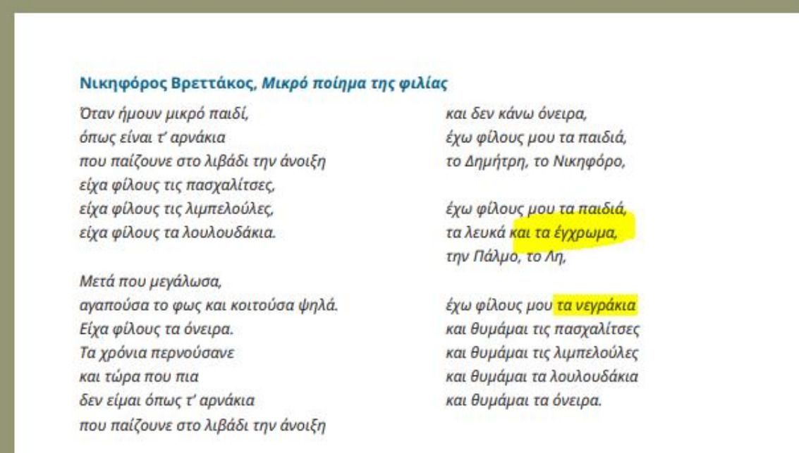 Άραγε ένα παιδί της Γ’ Δημοτικού που διαβάζει στην τάξη ή στο σπίτι από το σχολικό του βιβλίο ένα ποίημα για «νεγράκια» και για «αραπάκια», μπορεί να κατανοήσει το ποίημα σε σχέση με τον δημιουργό και τον χρόνο που γράφτηκε και πολύ περισσότερο την ακαταλληλότητα των λέξεων αυτών στο σήμερα;