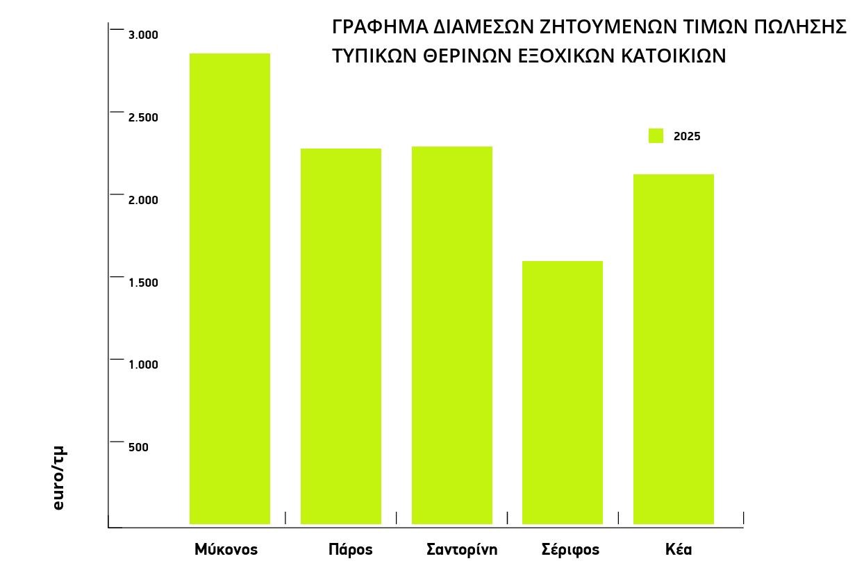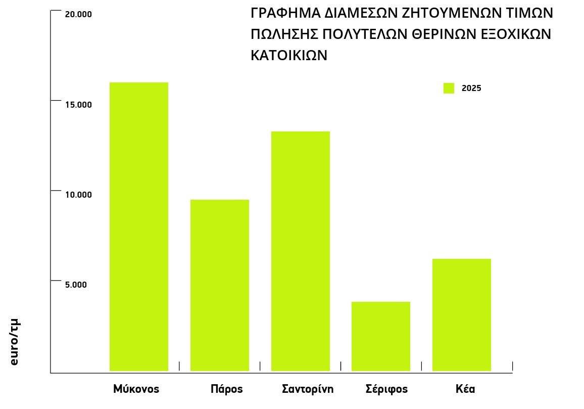 Στην έρευνα του παρατηρητηρίου αξιών «Geoaxis» η Μύκονος καταγράφει την υψηλότερη διάμεση ζητούμενη τιμή μονάδος στις θερινές κατοικίες πολυτελείς με 16.000 euro/τμ και ακολουθούν η Σαντορίνη με 13.292 euro/τμ και η Πάρος με 9.499 euro/τμ. Η Κέα καταγράφει 6.216 euro/τμ και η Σέριφος 3.827 euro/τμ.