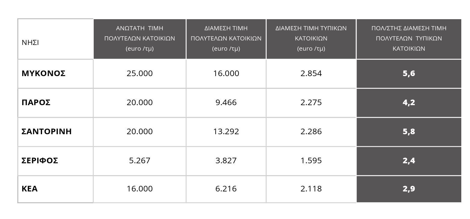 Αξιοσημείωτη είναι η διαφορά που καταγράφεται στις διάμεσες τιμές ζήτησης μεταξύ πολυτελών και τυπικών κατοικιών. Έτσι, στην Μύκονο μια πολυτελής κατοικία μπορεί να κοστίζει μέχρι και 5,6 φορές περισσότερο από μια τυπική θερινή κατοικία, στην Πάρο 4,2 φορές, στη Σαντορίνη 5,8 φορές, στη Σέριφο 2,4 φορές και στην Κέα 2,9 φορές.