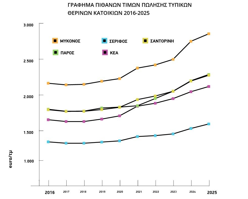 Ιδιαίτερα σημαντικά είναι τα αποτελέσματα της χρονικά βαθύτερης ανάλυσης για τις τυπικές θερινές κατοικίες, κατά τα τελευταία 10 χρόνια. Από την επεξεργασία των στοιχείων φαίνεται πως σε όλα τα νησιά καταγράφονται οι υψηλότερες αξίες της 10ετίας. Η Μύκονος καταγράφει την μεγαλύτερη αύξηση 32% και η Σέριφος την μικρότερη 19%.