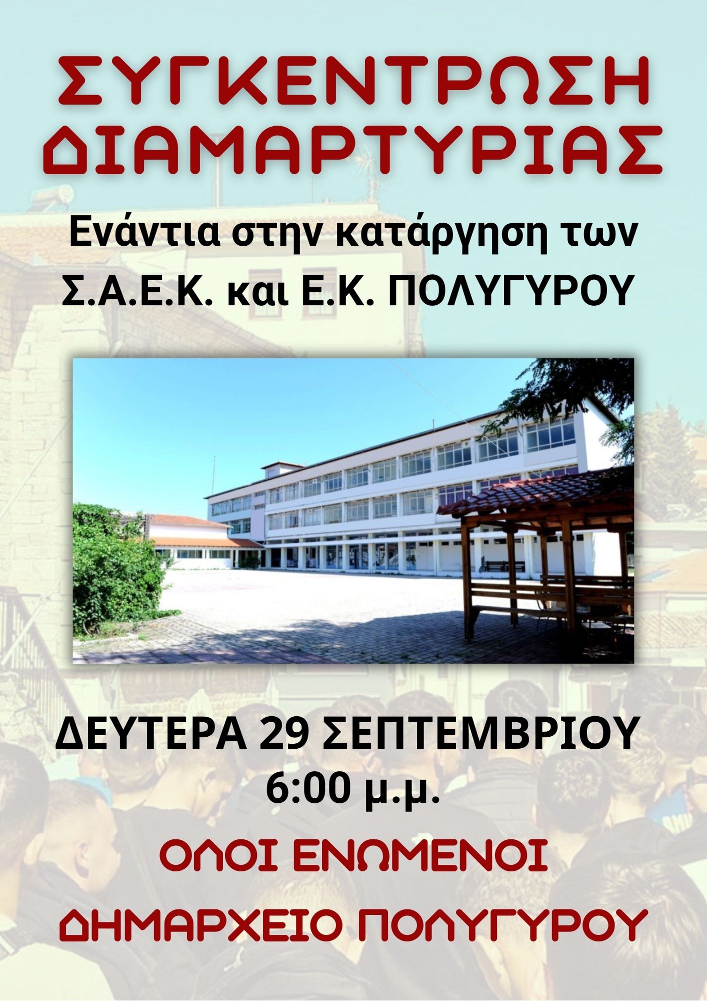 Τη Δευτέρα 29 Σεπτεμβρίου 2025, στις 18:00 θα πραγματοποιηθεί συγκέντρωση διαμαρτυρίας, στο Δημαρχείο Πολυγύρου, από μαθητές, σπουδαστές, γονείς, εκπαιδευτικούς και σύσσωμης της τοπικής κοινωνίας, που αντιδρούν στην εκπαιδευτική, επαγγελματική και κοινωνικής υποβάθμιση της πρωτεύουσας του Νομού Χαλκιδικής.