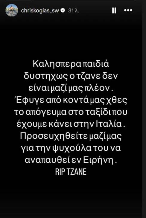 «Δυστυχώς, ο Τζάνε δεν είναι μαζί μας πλέον. Έφυγε από κοντά μας χθες το απόγευμα στο ταξίδι που έχουμε κάνει στην Ιταλία. Προσευχηθείτε μαζί μας για την ψυχούλα του να αναπαυθεί εν ειρήνη» έγραψε χαρακτηριστικά στην ανάρτησή του.