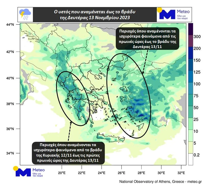 Σύμφωνα με την κατηγοριοποίηση του επεισοδίου βροχόπτωσης (RPI), η οποία εφαρμόζεται από τη μονάδα Meteo του Εθνικού Αστεροσκοπείου Αθηνών, το επεισόδιο βροχόπτωσης για την Κυριακή 12/11, κατατάσσεται στην Κατηγορία 2 (Μέτρια) και για τη Δευτέρα 13/11 στην Κατηγορία 3 (Σημαντική).