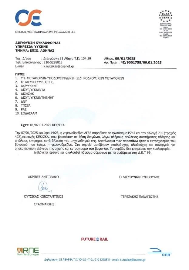 Ευτυχώς στο πρόσφατο συμβάν με τη γερανοδρεζίνα του ΟΣΕ δεν υπήρξε τραυματισμός του μηχανοδηγού της ή των άλλων επιβαινόντων εργαζομένων. Ωστόσο, όπως αποκαλύπτεται από την αναγγελία του συμβάντος, η οποία υποβλήθηκε δύο μέρες μετά από τον Οργανισμό στο υπουργείο Υποδομών και Μεταφορών, την Ρυθμιστική Αρχή Σιδηροδρόμων (ΡΑΣ) και τον Εθνικό Οργανισμό Διερεύνησης Ατυχημάτων (ΕΟΔΑΣΑΑΜ), «Την 07/01/2025 και ώρα 14.23, η γερανοδρεζίνα ΔΓ85 παραβίασε το φωτόσημα Π742 και την αλλαγή 705 (τροχιάς 402), περιοχής ΚΕΚ/ΣΚΑ, που βρισκόταν σε θέση διαγώνιο, λόγω πλήρους απώλειας συστήματος πέδησης και απώλειας κινητήρα, κατά δήλωση του μηχανοδηγού της».