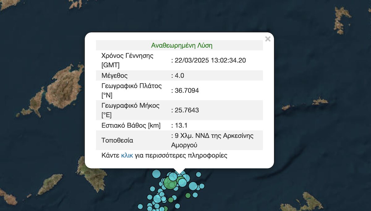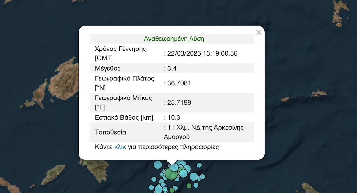 Μπαράζ σεισμών με επίκεντρο την Αμοργό σημειώθηκαν το μεσημέρι του Σαββάτου (22/03), με μεγέθη από 3,1 έως και 4 Ρίχτερ.