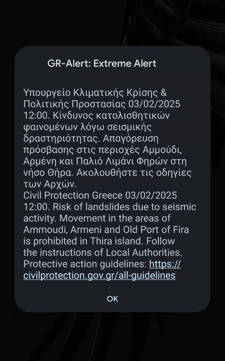 Μήνυμα του 112 εστάλη στη Σαντορίνη προειδοποιώντας τους κατοίκους για τον κίνδυνο κατολισθητικών φαινομένων λόγω της σεισμικής δραστηριότητας.