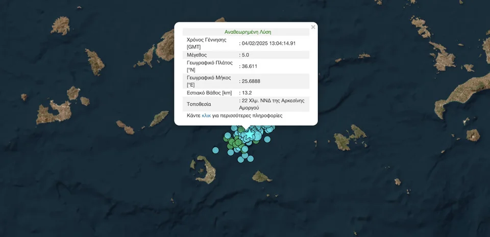 Σεισμός μεγέθους 5 Ρίχτερ σημειώθηκε στις 15:04 στη θαλάσσια περιοχή ανοιχτά της Αμοργού.