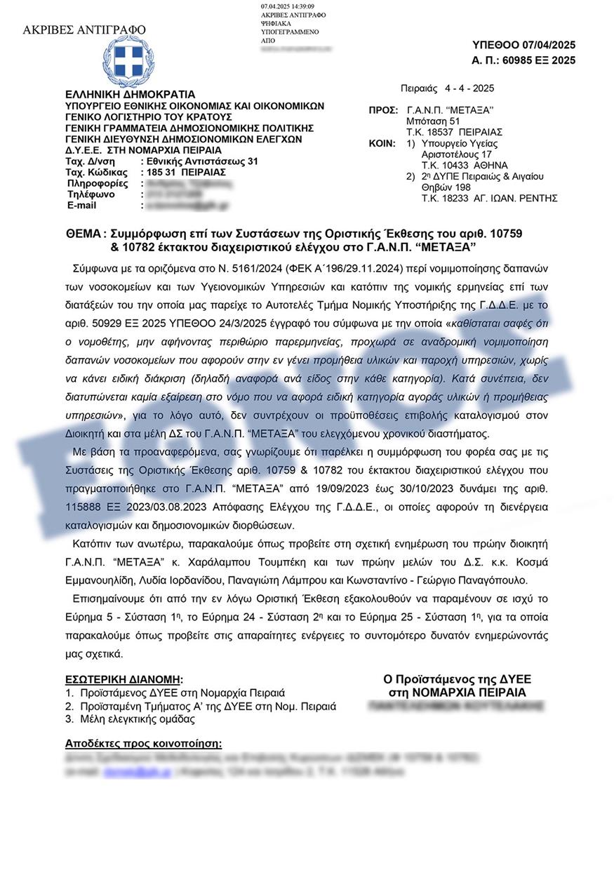 Όπως ρητώς αναγράφεται στην με αριθμό 60985ΕΞ2025 απόφαση του δεν συντρέχουν οι προϋποθέσεις καταλογισμού στον Διοικητή και στα μέλη του ΔΣ του Γ.Α.Ν.Π. «Μεταξά».