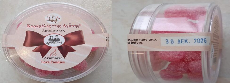 Καραμέλες «της Αγάπης-Αρωματικές» με ημερομηνία ανάλωσης πριν από τις 30 ΔΕΚ. 2026, συσκευασίας καθαρού βάρους περίπου 110g της εταιρείας με διακριτικό τίτλο «αρκαδιανή» που εδρεύει στο Ψάρι Αρκαδίας.