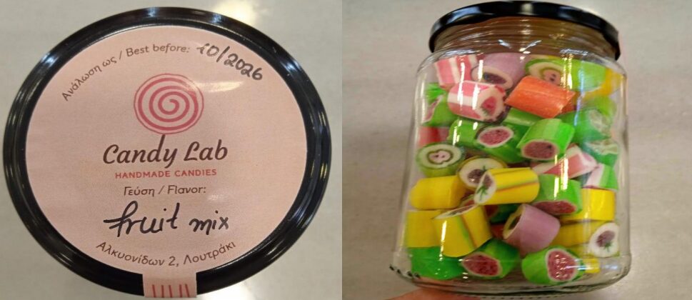 Καραμέλες «fruit mix» με ημερομηνία ανάλωσης ως 10/2026, συσκευασίας καθαρού βάρους περίπου 230g, το οποίο παράγεται και συσκευάζεται στην Ελλάδα από την «Candy Lab» που εδρεύει στο Λουτράκι Κορινθίας.