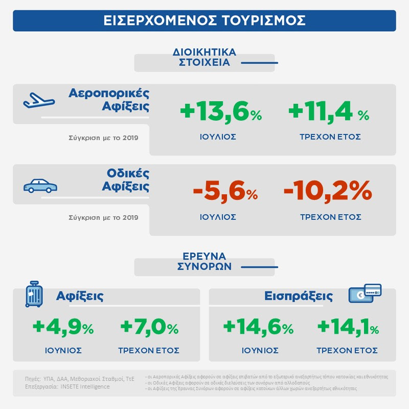 Τα τελευταία διαθέσιμα στοιχεία εισερχόμενου τουρισμού είναι στην πλειονότητά τους αυξητικά τόσο σε σχέση με την αντίστοιχη περυσινή περίοδο όσο και σε σχέση με το 2019 βάσει στοιχείων του INSETE Intelligence