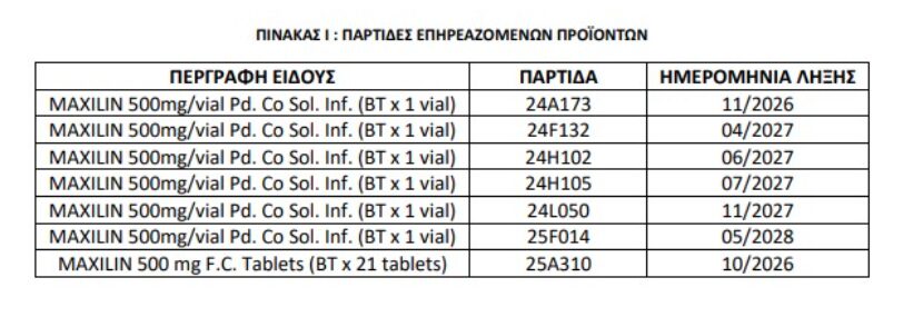 Την ανάκληση των παρτίδων των φαρμακευτικών προϊόντων MAXILIN PD. SOL. INF. 500mg/vial και MAXILIN 500mg/tab του συνημμένου πίνακα Ι, που περιέχουν τη δραστική α’ ύλη Claricomythrin παραγωγής του εργοστασίου SM BIOMED SDN BHD Μαλαισίας, λόγω ανάκλησης του Πιστοποιητικού CEP.
