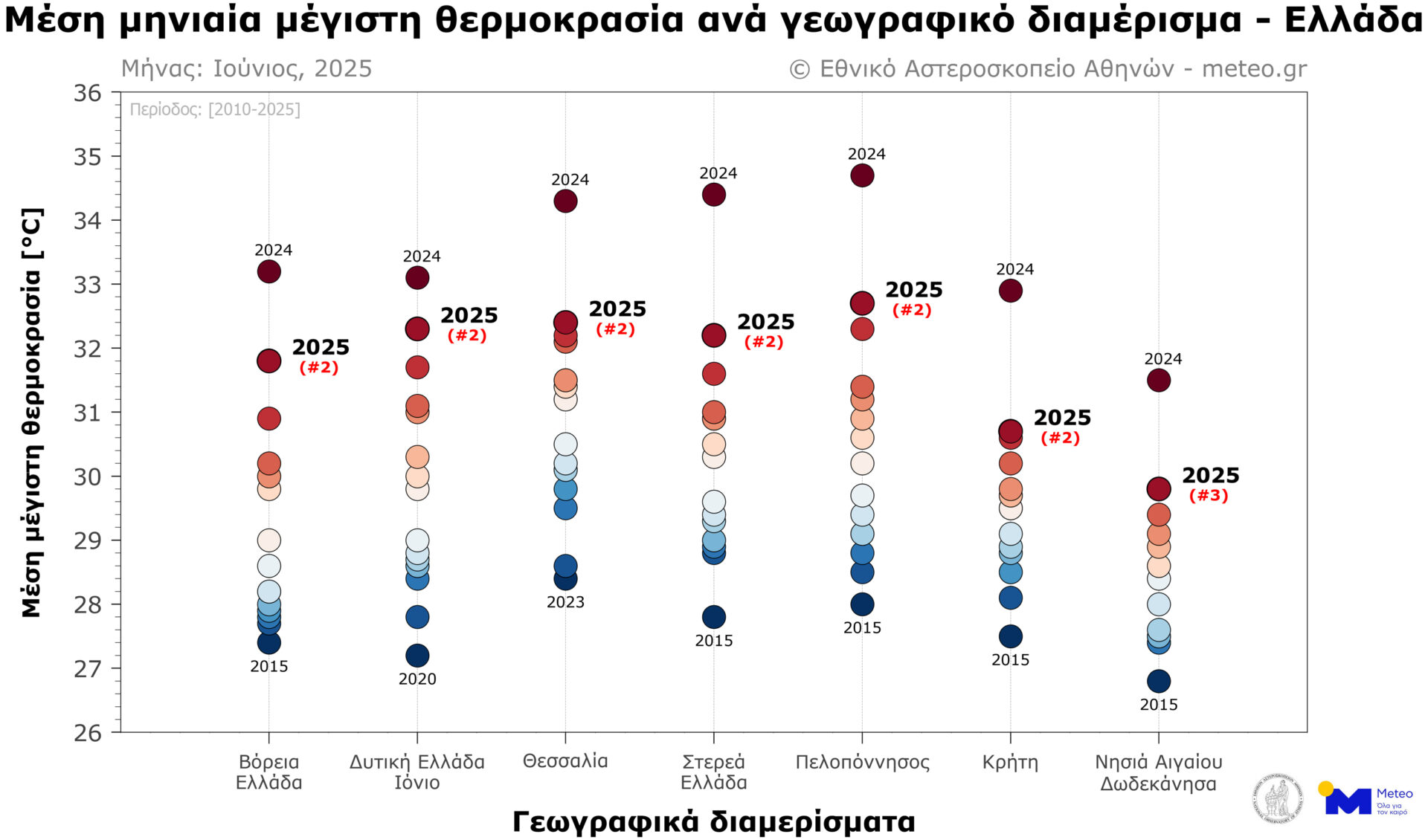 Σε όλα τα γεωγραφικά διαμερίσματα της χώρας (εκτός από τα Νησιά του Αιγαίου και τα Δωδεκάνησα) ο Ιούνιος του 2025 ήταν ο 2ος θερμότερος από το 2010 μετά τον περσινό Ιούνιο (2024) όπου παραμένει με διαφορά ο θερμότερος Ιούνιος στα χρονικά των καταγραφών.