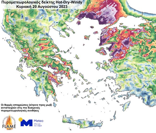 Οι πολύ θερμές και ξηρές συνθήκες που ήδη επηρεάζουν τη χώρα μας και οι οποίες θα επιμείνουν έως και την Παρασκευή 25.08.2023, σε συνδυασμό με την πολύ υψηλή ευκολία ανάφλεξης των δασικών καυσίμων και τους κατά τόπους ενισχυμένους ανέμους, αναμένεται να διαμορφώσουν ιδιαίτερα επικίνδυνες πυρομετεωρολογικές συνθήκες, ικανές να δυσχεράνουν τον έλεγχο τυχόν δασικών πυρκαγιών που εκδηλωθούν. Ειδικότερα και με βάση τα πιο πρόσφατα διαθέσιμα προγνωστικά στοιχεία της Πυρομετεωρολογικής Ομάδας FLAME της μονάδας ΜΕΤΕΟ/ΕΑΑ, πολύ υψηλή έως και ακραία επικινδυνότητα με καιρό τύπου Hot-Dry-Windy αναμένεται την Κυριακή και τη Δευτέρα, 20 -21.08.2023 σε μεγάλο τμήμα της ηπειρωτικής Ελλάδας και των νησιών του Β. Αιγαίου.