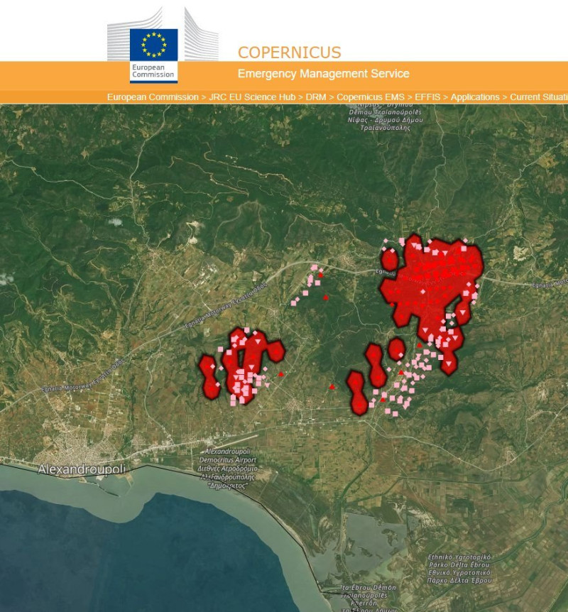 Δορυφορική εικόνα που αποτυπώνει το μέγεθος της καταστροφικής πυρκαγιάς που μαίνεται από χθες στην Aλεξανδρούπολη, απειλώντας οικισμούς και οδηγώντας σε εκκενώσεις μέχρι αυτή την ώρα έδωσε στη δημοσιότητα η ευρωπαική υπηρεσίας διαχείρισης έκτακτης ανάγκης «Copernicus», η οποία ενεργοποιήθηκε για την άμεση χαρτογράφηση περιοχών των περιοχών που έχουν πληγεί μέχρι στιγμής από την φωτιά.