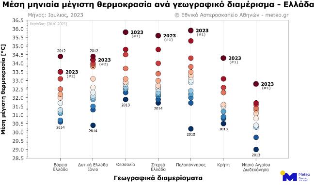 Το επόμενο γράφημα παρουσιάζει την κατάταξη του μήνα Ιουλίου ανά έτος, ανάλογα με τη μέση μηνιαία τιμή της μέγιστης θερμοκρασίας. Για τη Θεσσαλία, τη Στερεά Ελλάδα, την Πελ/νησο, την Κρήτη, και τα υπόλοιπα νησιά του Αιγαίου ήταν ο πιο θερμός Ιούλιος από το 2010. Για τη Βόρεια Ελλάδα και την Ήπειρο, ήταν ο 2ος πιο θερμός μήνας τα τελευταία 14 χρόνια.