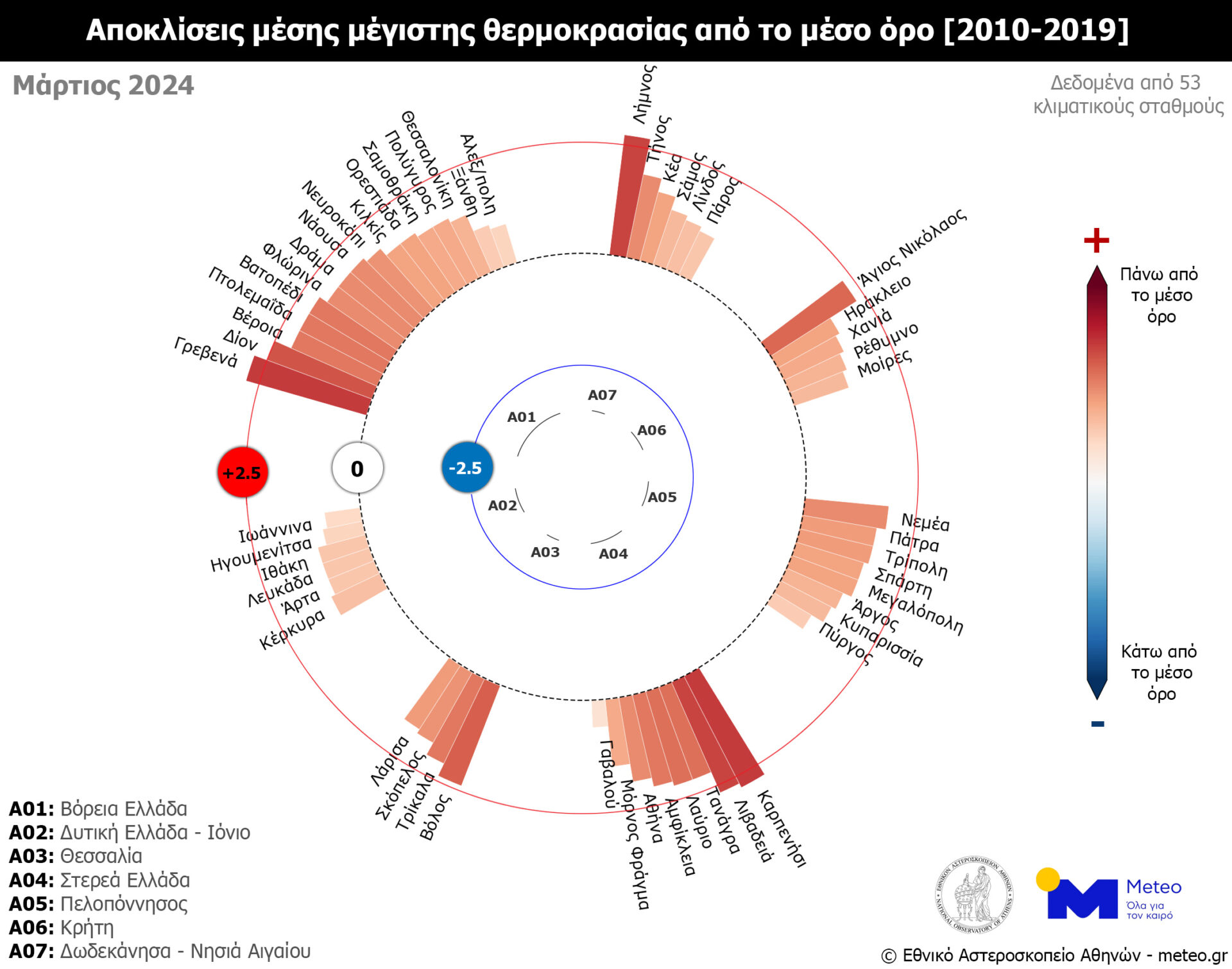 Ο φετινός Μάρτιος χαρακτηρίστηκε από πολλές ημέρες με θετικές αποκλίσεις θερμοκρασίας και ήταν o πιο θερμός Μάρτιος από το 2010 στη Θεσσαλία, στη Στερεά Ελλάδα, στην Πελ/νησο και τα Νησιά του Αιγαίου (εκτός της Κρήτης). Στη Θεσσαλία και στη Στερεά Ελλάδα καταγράφηκαν οι μεγαλύτερες θετικές αποκλίσεις θερμοκρασίας, με τις μέσες μηνιαίες τιμές να κυμαίνονται έως και 2.0 °C πάνω από τα κανονικά για την εποχή επίπεδα. Στα Νησιά του Αιγαίου, συμπεριλαμβανομένης της Κρήτης, καταγράφηκαν μικρότερες αποκλίσεις, +1.6 °C.