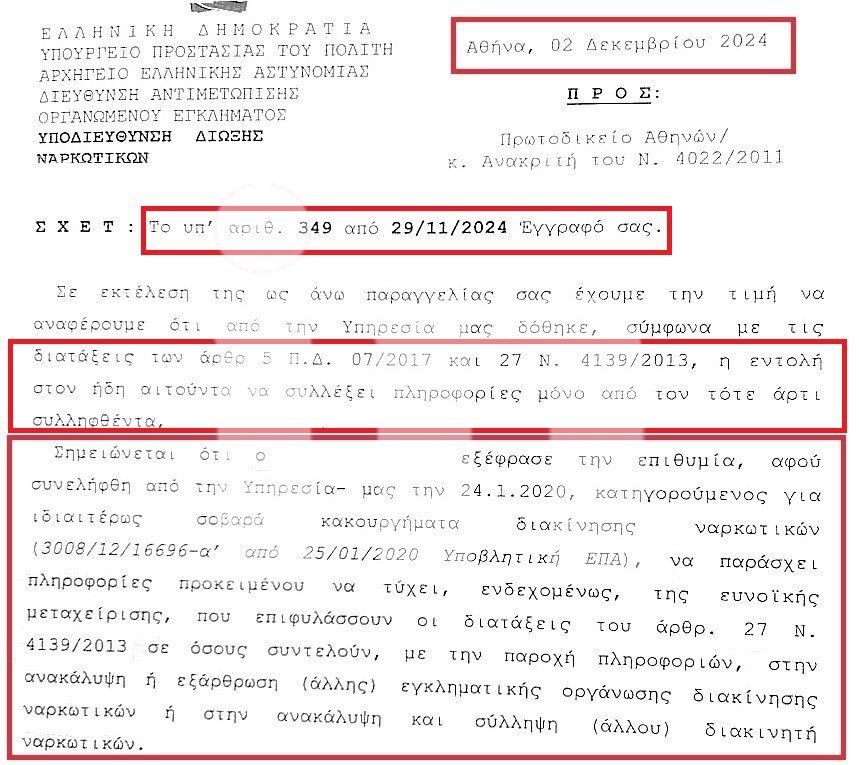 Τα ερωτήματα δημιουργούνται ύστερα από επιστολή που εστάλη προσφάτως στις δικαστικές αρχές –κι αποκαλύπτει το in- από την Δίωξη Ναρκωτικών ότι είχε δοθεί άνωθεν υπηρεσιακή εντολή στον ελεγχόμενο αξιωματικό να επικοινωνεί με έναν εξ αυτών των διακινητών ναρκωτικών. Καθότι ο τελευταίος ήθελε να δώσει πληροφορίες στις αρχές ασφαλείας!