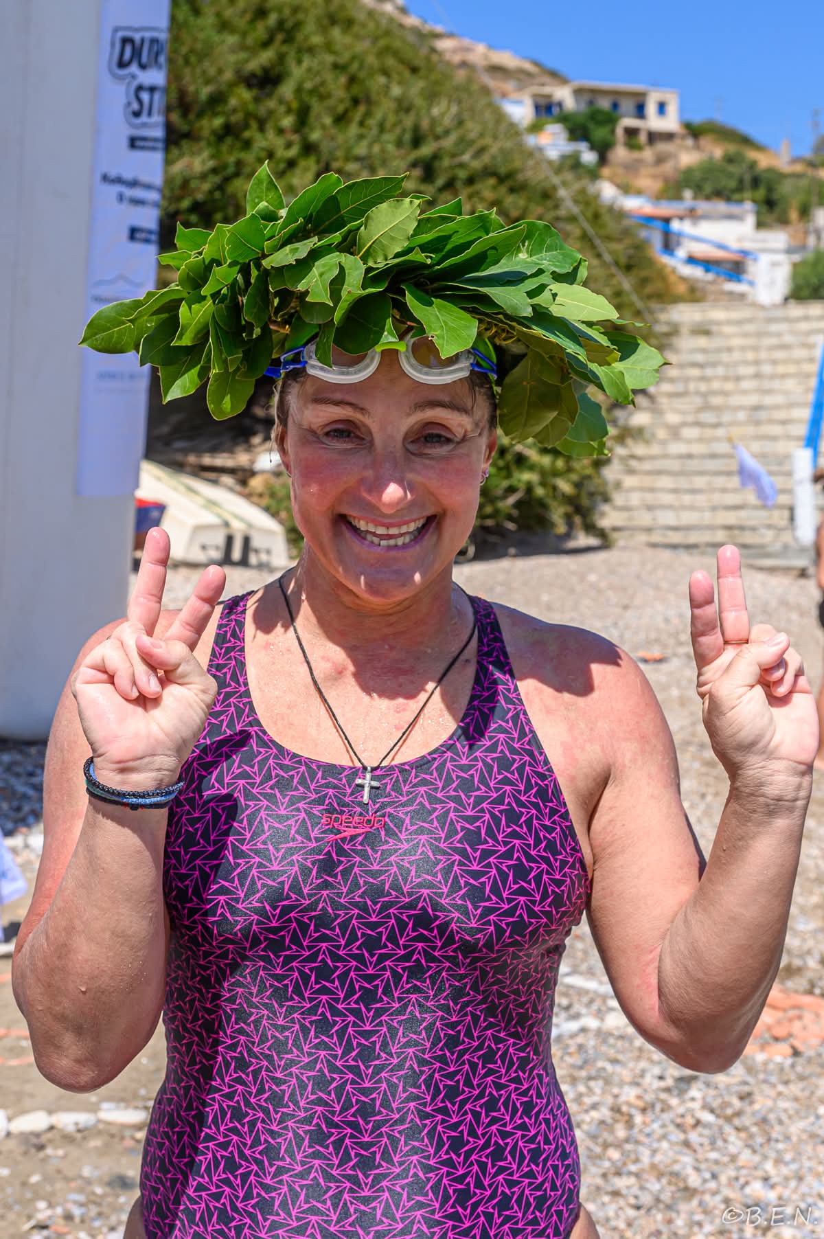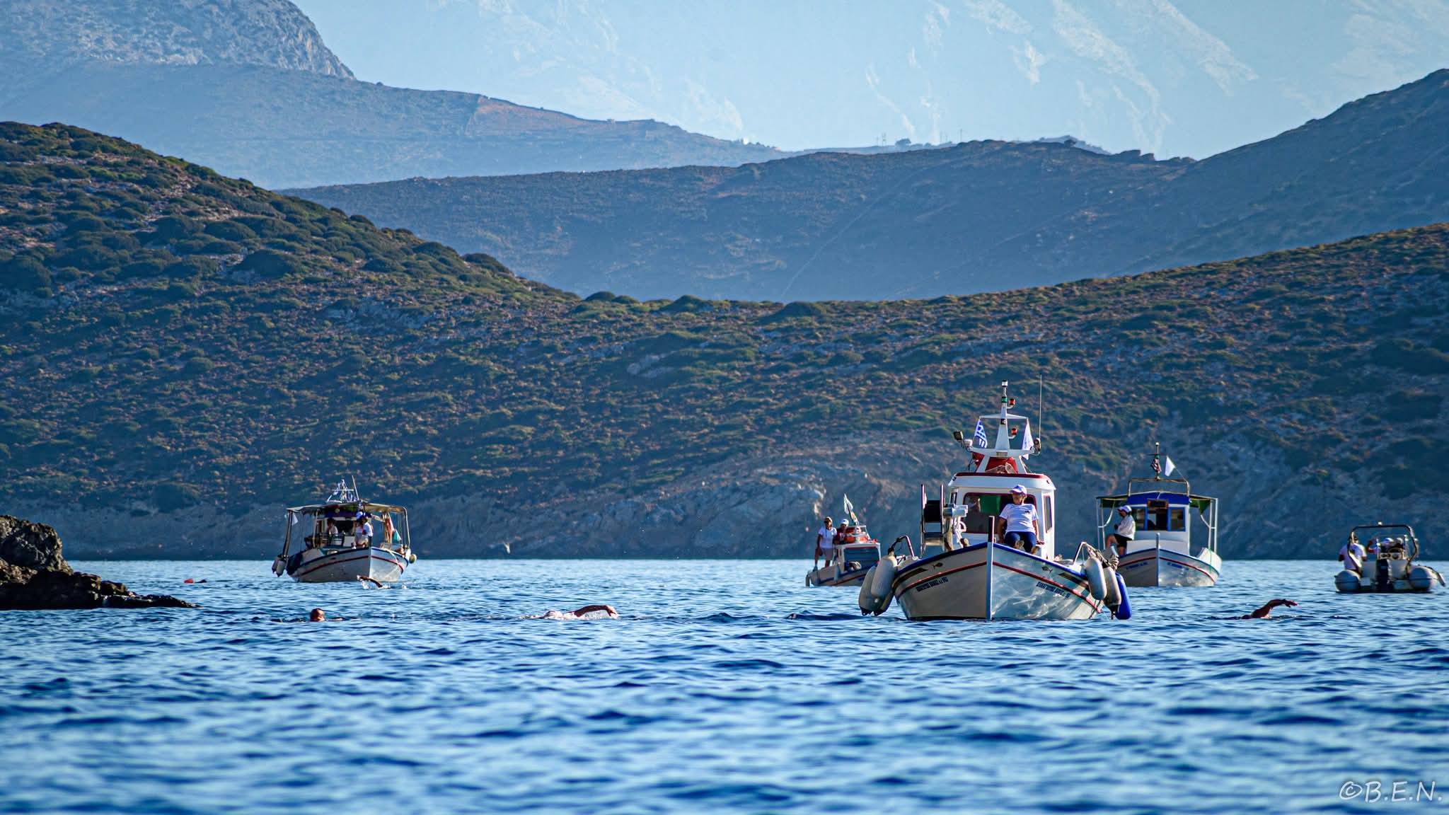 Κολύμπησαν 17 αθλητές και αθλήτριες σε μια απαιτητική διαδρομή λόγω πελάγους, ρευμάτων και μποφόρ 17 χιλιομέτρων γύρω από το νησί, συνοδευόμενοι από καΐκια, διασώστες και εθελοντές, μέσα σε μια ατμόσφαιρα ασφάλειας, συνεργασίας και αλληλεγγύης.