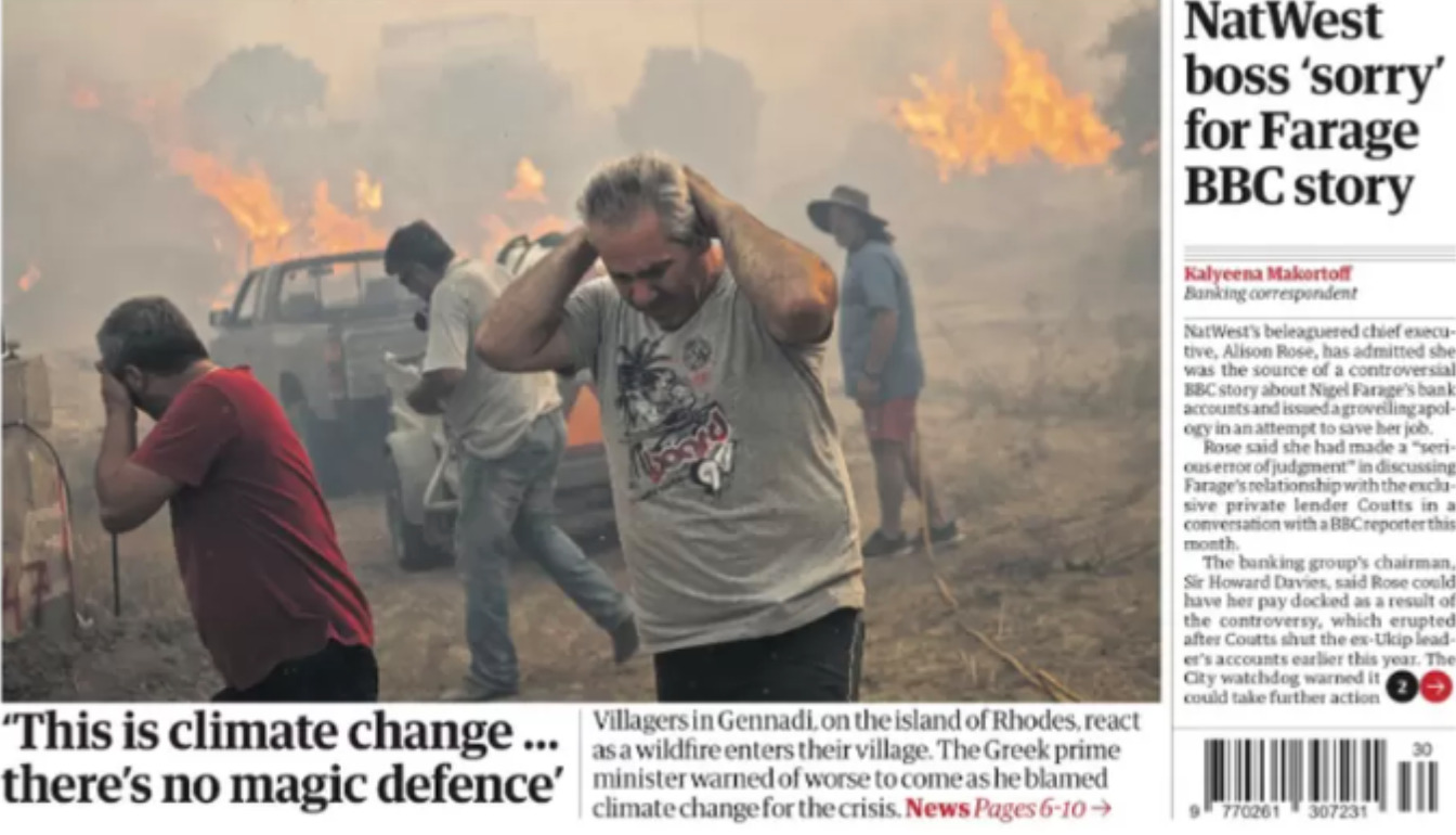 Στα πρωτοσέλιδα του βρετανικού τύπου παραμένουν οι πυρκαγιές σε Κέρκυρα και Ρόδο με την «Μιrror» να γράφει για την «κόλαση της Ρόδου». Mε την συγκλονιστική εικόνα απελπισμένων κατοίκων στο Γεννάδι να κρατούν το πρόσωπό τους από απόγνωση ο Gurdian γράφει για την κλιματική αλλαγή και την αδυναμία αντίδρασης.