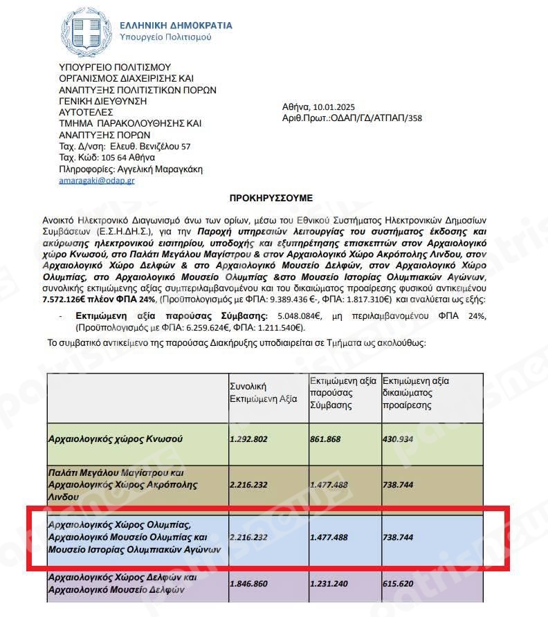 Όπως αναφέρεται σε ρεπορτάζ του Γιώργου Μικελόπουλου στο patrisnews.gr, η απόφαση σε σχέση με την Αρχαία Ολυμπία αφορά τον αρχαιολογικό χώρο, το Αρχαιολογικό Μουσείο Ολυμπίας και το Μουσείο Ιστορίας Ολυμπιακών Αγώνων με τη συνολική εκτιμώμενη αξία της σύμβασης να ανέρχεται στα 2.216.232 ευρώ εκ των οποίων τα 1.477.488 ευρώ αφορούν την εκτιμώμενη αξία της Σύμβασης και οι 738.744 ευρώ την εκτιμώμενη αξίας προαίρεσης.