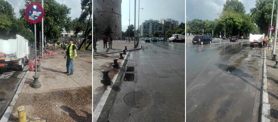 Οι ξαφνικές νεροποντές και η κατά τόπους χαλαζόπτωση που σημειώθηκαν το απόγευμα της Κυριακής 2 Ιουνίου 2019, είχαν ως συνέπεια τη συσσώρευση φερτών υλικών στην περιοχή του Λευκού Πύργου και του Βασιλικού Θεάτρου, όπου καταλήγουν τα όμβρια ύδατα.