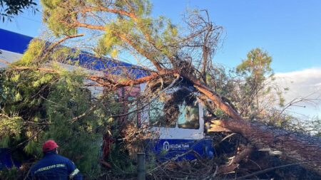 Συναγερμός σήμανε το πρωί της Τρίτη στις αρμόδιες Αρχές, όταν κατά τη διέλευση τρένου από το δρομολόγιο Πύργος – Κατάκολο, μεγάλο πεύκο έπεσε αιφνιδιαστικά πάνω στο βαγόνι του μηχανοδηγού.