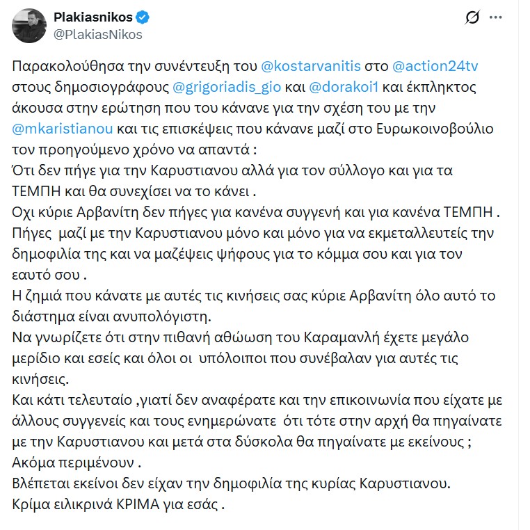 Με ανάρτησή του στο Χ ο Νίκος Πλακιάς σχολίασε πως ο Κώστας Αρβανίτης πήγε μαζί με την Μαρία Καρυστιανού στο Ευρωκοινοβούλιο, όχι για να στηρίξει τον σύλλογο των Τεμπών, αλλά για να μαζέψει ψήφους εκμεταλλευόμενος τη δημοφιλία της.