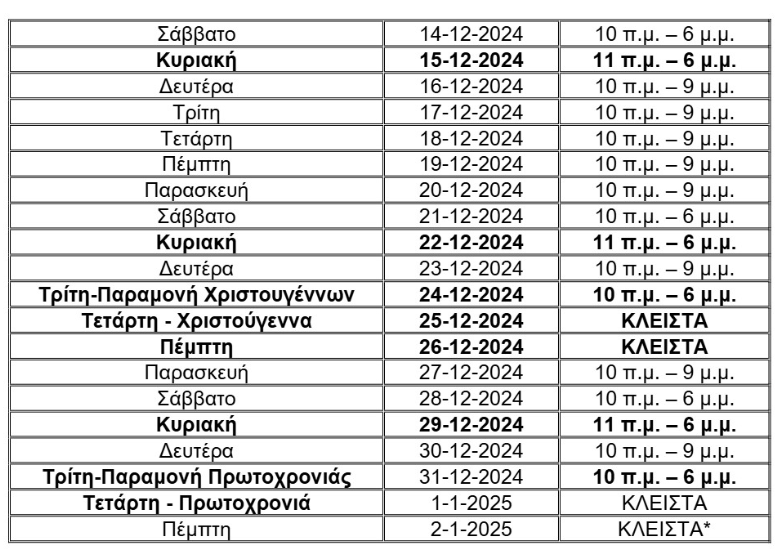 Τα καταστήματα μπορούν να είναι ανοιχτά τις Κυριακές 15,22 και 29 Δεκεμβρίου, από τις 11.00 το πρωί, μέχρι τις 18.00 το απόγευμα.