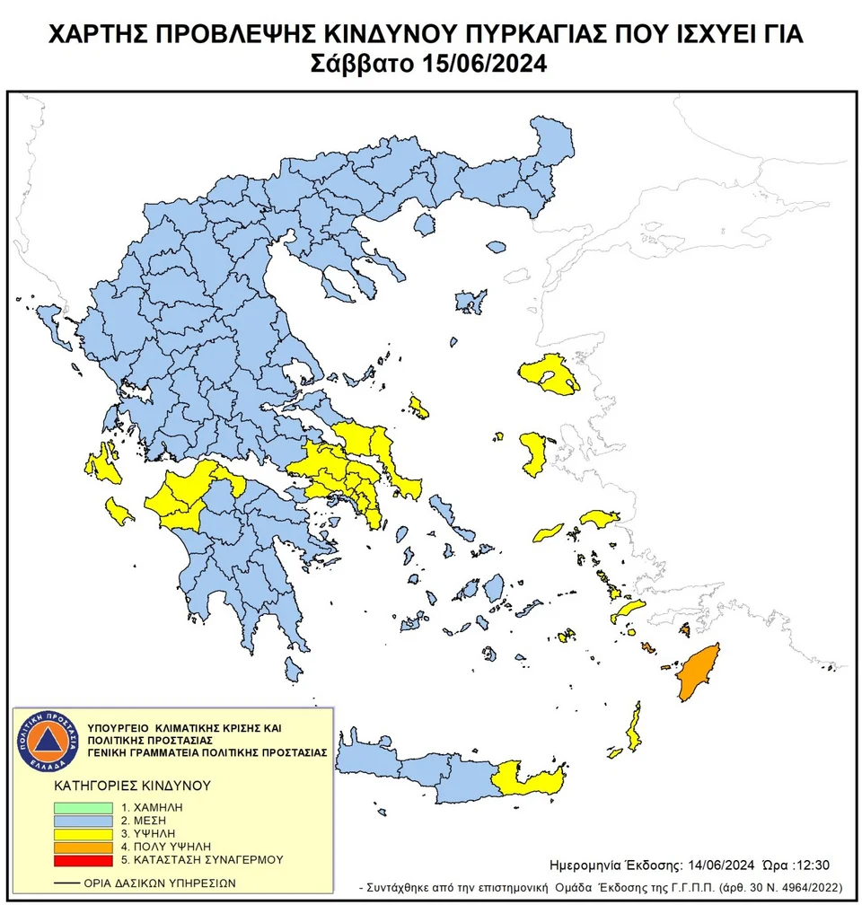 Σύμφωνα με το Χάρτη Πρόβλεψης Κινδύνου Πυρκαγιάς που εκδίδει η Γενική Γραμματεία Πολιτικής Προστασίας του Υπουργείου Κλιματικής Κρίσης & Πολιτικής Προστασίας (civilprotection.gov.gr), για αύριο Σάββατο 15 Ιουνίου, προβλέπεται πολύ υψηλός κίνδυνος πυρκαγιάς (κατηγορία κινδύνου 4) για τις εξής περιοχές: