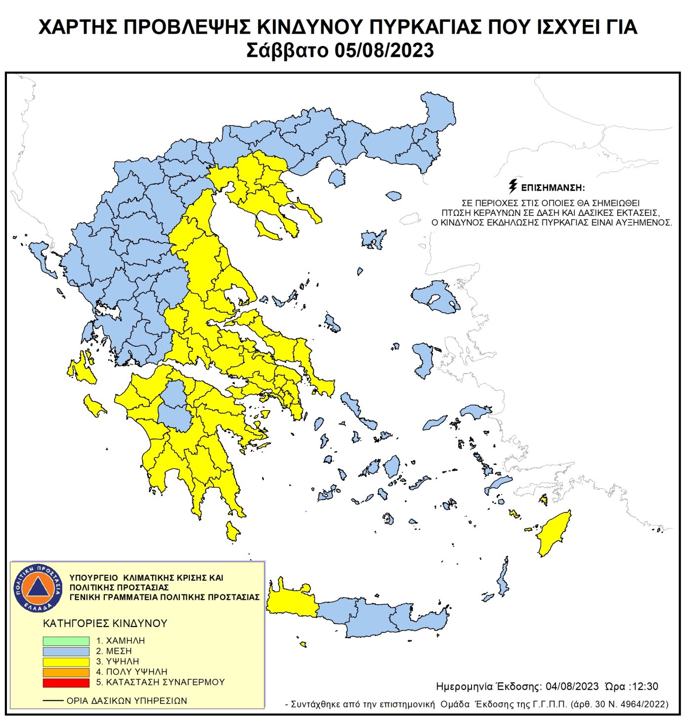 Σας ενημερώνουμε ότι σύμφωνα με τον από 05/08/2023 Ημερήσιο Χάρτη Πρόβλεψης Κινδύνου Πυρκαγιάς που εκδίδει η Γενική Γραμματεία Πολιτικής Προστασίας του Υπουργείου Κλιματικής Κρίσης και Πολιτικής Προστασίας (www.civilprotection.gr), για το ΣΑΒΒΑΤΟ 05-08-2023, προβλέπεται ΥΨΗΛΟΣ κίνδυνος πυρκαγιάς (κατηγορία κινδύνου 3) Π.Ε.ΧΑΛΚΙΔΙΚΗΣ