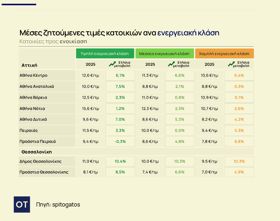 Σημαντική είναι η διαφορά της ΜΖΤ ενοικίασης κατοικίας με υψηλή ενεργειακή κλάση στα Νότια Προάστια σε σύγκριση με τη ΜΖΤ κατοικίας με χαμηλή ενεργειακή κλάση της τάξης του 46%. Κατά 22% ακριβότερες είναι οι κατοικίες προς ενοικίαση με υψηλή ενεργειακή κλάση σε σχέση με αυτές με χαμηλή ενεργειακή κλάση στον Πειραιά και τα Προάστιά του. Το Κέντρο της Αθήνας παρουσιάζει υψηλές ζητούμενες τιμές σε όλες τις ενεργειακές κλάσεις, με σχετικά ομοιόμορφες ετήσιες αυξήσεις περίπου 6% ανεξαρτήτως κλάσης. Αντίθετα, τα Δυτικά Προάστια της Αθήνας και η Ανατολική Αθήνα εμφανίζουν χαμηλότερα επίπεδα τιμών, αλλά καταγράφουν ισχυρότερες ετήσιες αυξήσεις, κυρίως στις κατοικίες υψηλής ενεργειακής κλάσης.