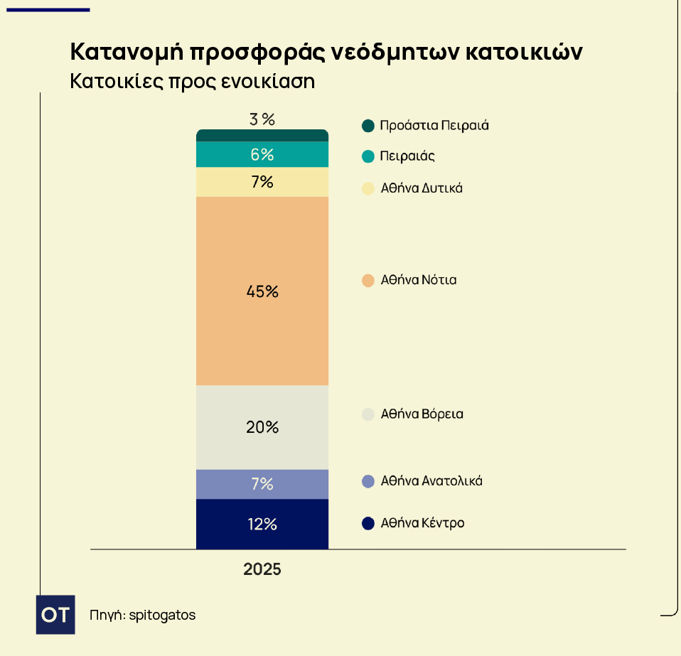 Σε ό,τι αφορά τις κατοικίες προς ενοικίαση, τα Νότια Προάστια συγκεντρώνουν το 45% του συνολικού διαθέσιμου stock νεόδμητων κατοικιών στην Αττική το 2025, ενώ ακολουθούν τα Βόρεια Προάστια με ποσοστό 20%, μειωμένο κατά 4% σε σχέση με την προηγούμενη χρονιά. Ακολουθεί ο Δήμος Αθηναίων με ποσοστό 12%, ενώ μικρότερα ποσοστά εντοπίζονται στα Ανατολικά και Δυτικά Προάστια, καθώς και στον Πειραιά και τα Προάστιά του.