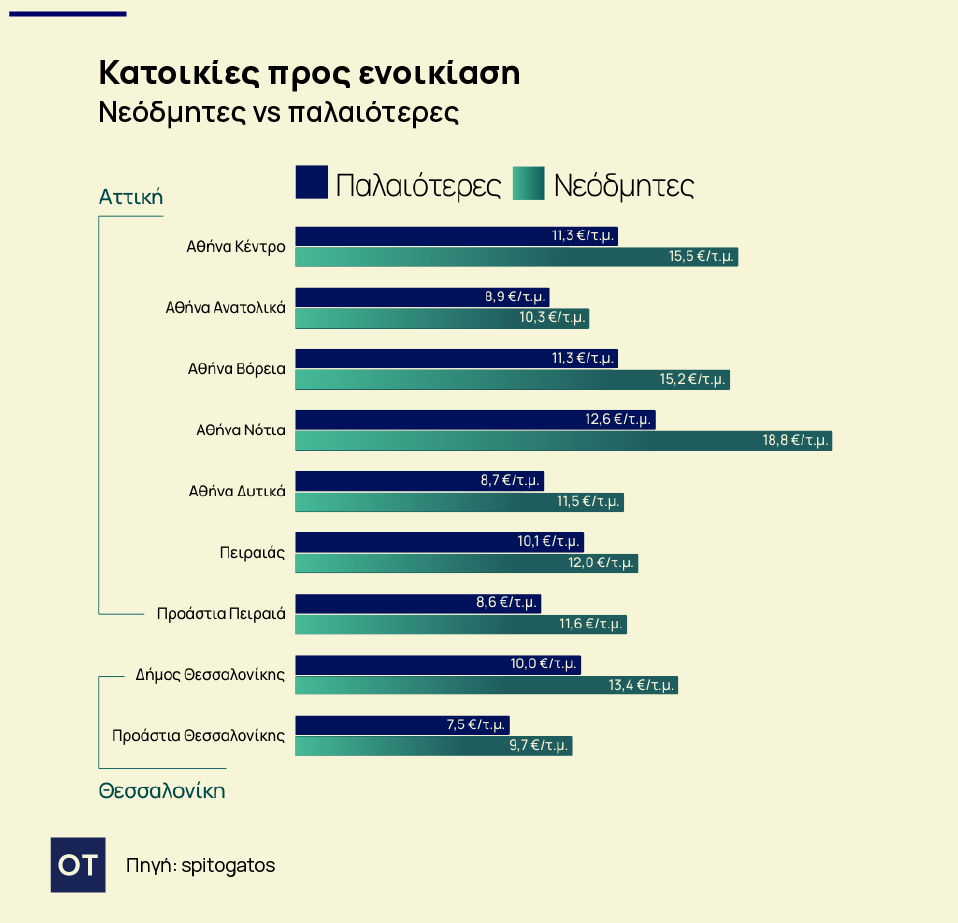 Ακίνητα και ενοικίαση Σε ό,τι αφορά τις κατοικίες προς ενοικίαση στην Αττική, οι υψηλότερες ΜΖΤ ενοικίασης νεόδμητων κατοικιών εντοπίζονται και πάλι στα Νότια Προάστια, καθώς και στον Δήμο Αθηναίων. Στον αντίποδα, οι χαμηλότερες ΜΖΤ ενοικίασης νεόδμητων κατοικιών εντοπίζονται στο Υπόλοιπο Αττικής και στα Δυτικά Προάστια. Σημαντική διαφορά στη ΜΖΤ ενοικίασης σημειώνεται στα Νότια Προάστια, όπου οι νεόδμητες κατοικίες προς ενοικίαση το 2025 ήταν κατά 48,5% ακριβότερες από τις παλαιότερες. Αντίστοιχα, στο Κέντρο της Αθήνας, οι νεόδμητες κατοικίες προς ενοικίαση είναι κατά 36,8% ακριβότερες από τις παλαιότερες κατοικίες προς ενοικίαση στην ίδια περιοχή.