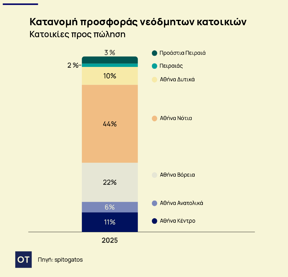 To Spitogatos Insights εξέτασε την κατανομή της προσφοράς νεόδμητων κατοικιών (stock) στους διάφορους τομείς της Αττικής το 2025. Σημαντικό ενδιαφέρον παρουσιάζει το γεγονός ότι πάνω από το 60% των διαθέσιμων νεόδμητων κατοικιών στην Αττική συγκεντρώνεται στα Νότια και στα Βόρεια Προάστια, όπου καταγράφονται και οι υψηλότερες ΜΖΤ πώλησης. Αντίθετα, χαμηλότερα ποσοστά εντοπίζονται στον Δήμο Αθηναίων και στα Δυτικά Προάστια.