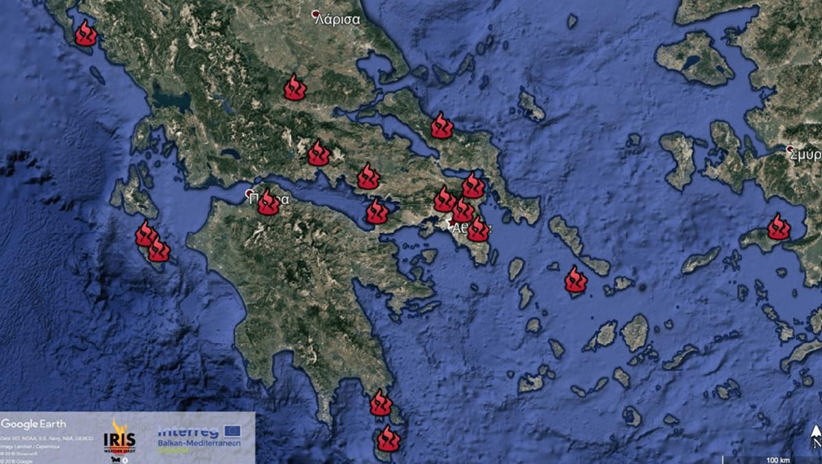 Στο πλαίσιο της φετινής αντιπυρικής περιόδου (01/05 – 28/10/2019) εφαρμόστηκε επίσης, για πρώτη φορά επιχειρησιακά, το προγνωστικό σύστημα IRIS, το οποίο παρείχε κατ’ αίτηση (on demand) προγνώσεις εξάπλωσης πυρκαγιών. Ειδικότερα, για το διάστημα από 01/05 έως και 28/10/2019, το σύστημα IRIS ενεργοποιήθηκε από το Ενιαίο Συντονιστικό Κέντρο Επιχειρήσεων (ΕΣΚΕ) του Πυροσβεστικού Σώματος σε 17 περιστατικά πυρκαγιών, με σκοπό την παροχή προγνώσεων εξάπλωσης για τις επόμενες 6/24 ώρες. Οι θέσεις των πυρκαγιών για τις οποίες ενεργοποιήθηκε φέτος το προγνωστικό σύστημα IRIS παρουσιάζονται στην επόμενη εικόνα