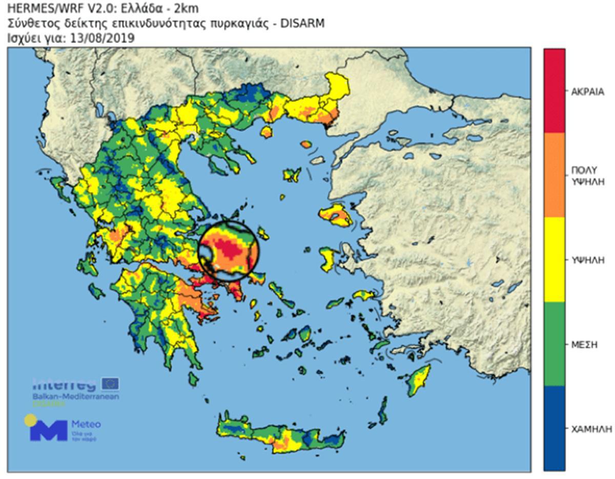 Τέλος, έχει ιδιαίτερη αξία να σημειωθεί πως η περιοχή στην οποία ξέσπασε η πυρκαγιά της 13ης Αυγούστου 2019 είχε επιτυχώς επισημανθεί με ακραία επικινδυνότητα, με βάση το σύνθετο πυρό-μετεωρολογικό δείκτη DISARM. Ο συγκεκριμένος δείκτης βασίζεται στο συνδυασμό 4 πυρό-μετεωρολογικών δεικτών, αποσκοπώντας στην αντικειμενική αξιολόγηση της επικινδυνότητας για την εκδήλωση και εξάπλωση δασικών πυρκαγιών. Κατά τη διάρκεια της φετινής αντιπυρικής περιόδου (01/05 – 28/10/2019) εφαρμόστηκε για πρώτη φορά πιλοτικά στη χώρα μας με ενθαρρυντικά αποτελέσματα. Σε αντίθεση με υφιστάμενους δείκτες επικινδυνότητας, ο σύνθετος δείκτης DISARM αξιολογεί την επικινδυνότητα σε πολύ υψηλή οριζόντια ανάλυση, ίση με 2 km.