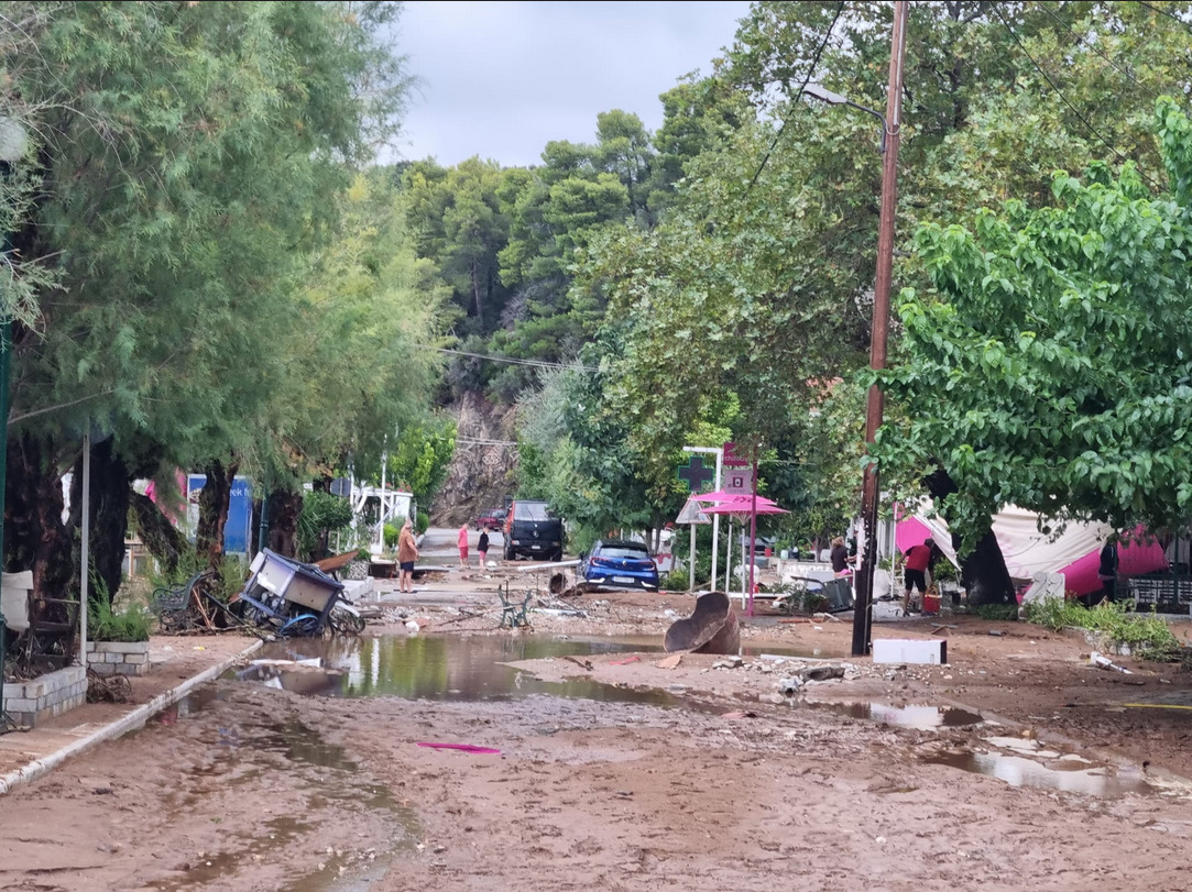 Εικόνες χάους επικρατούν από τα ξημερώματα της Τετάρτης στον Αλμυροπόταμο στην Εύβοια, από την καταστροφική επέλαση της κακοκαιρίας Daniel.