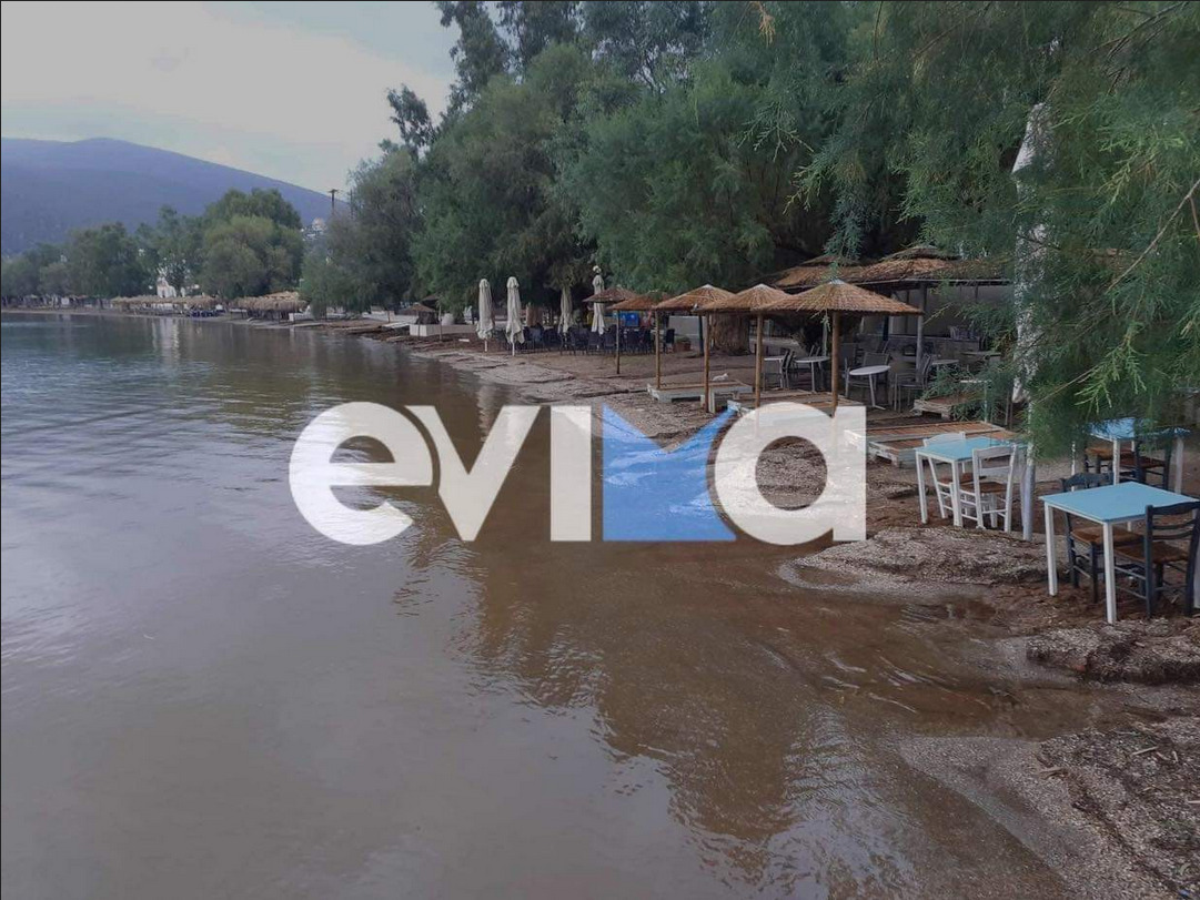 Ο μεγάλος όγκος νερού κατάφερε να καλύψει μέχρι και την παραλία του Αλμυροποτάμου χαρακτηριστικά όπως θα δείτε στο βίντεο του evima.gr, το νερό κατάφερε να γίνει ένα με την θάλασσα.
