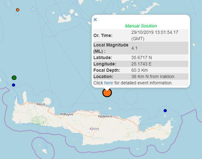Σεισμική δόνηση εντάσεως 4,1 βαθμών της κλίμακας Ρίχτερ, σύμφωνα με το Γεωδυναμικό Ινστιτούτο σημειώθηκε στις 3 το μεσημέρι. Η τοποθεσία ήταν 36 χλμ ΒΒΑ του Ηρακλείου σε βάθος 36,7 χιλιομέτρων.