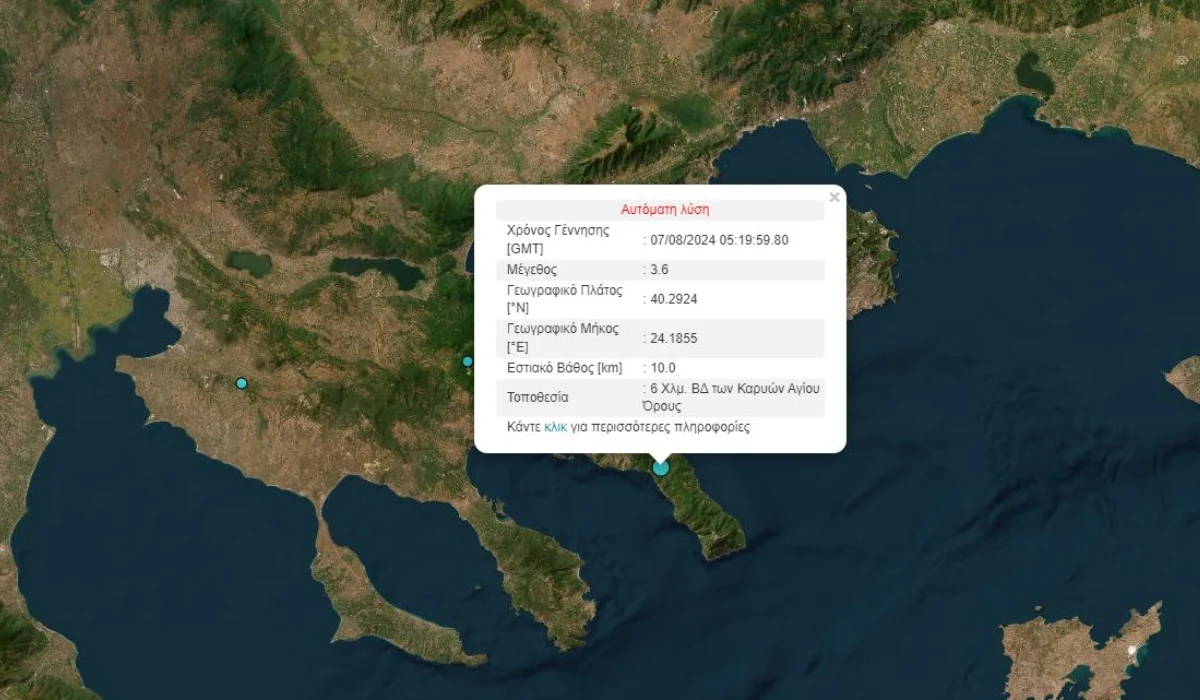 Σεισμός μεγέθους 3,6 βαθμών της κλίμακας Ρίχτερ σημειώθηκε στις 8:19 το πρωί της Τετάρτης (7/8) στο Άγιο Όρος, στη Χαλκιδική.