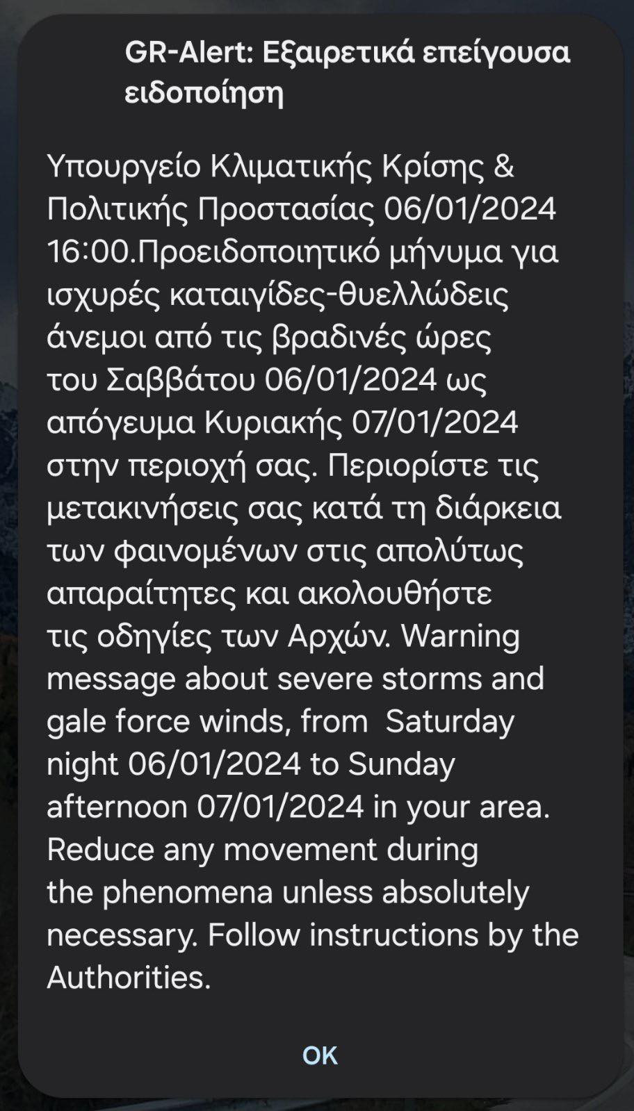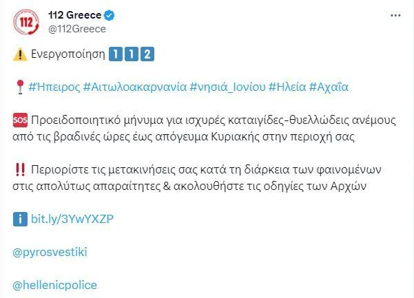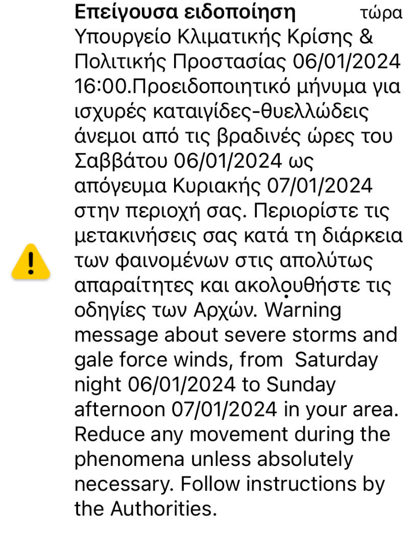 Την ίδια στιγμή, το μήνυμα από την Πολιτική Προστασία στάλθηκε και στους πολίτες στην Ήπειρο, την Αιτωλοακαρνανία, τα νησιά του Ιονίου, την Ηλεία και την Αχαΐα, προειδοποιώντας για ισχυρές καταιγίδες και δυνατούς ανέμους.