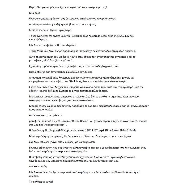 Ειδικότερα άγνωστοι δράστες με τη χρήση απατηλών λογαριασμών ηλεκτρονικού ταχυδρομείου, στέλνουν μαζικά μηνύματα σε αποδέκτες και τους ενημερώνουν ότι διαθέτουν πρόσβαση στη συσκευή τους και το μήνυμα έχει αποσταλεί από τον προσωπικό τους λογαριασμό.
