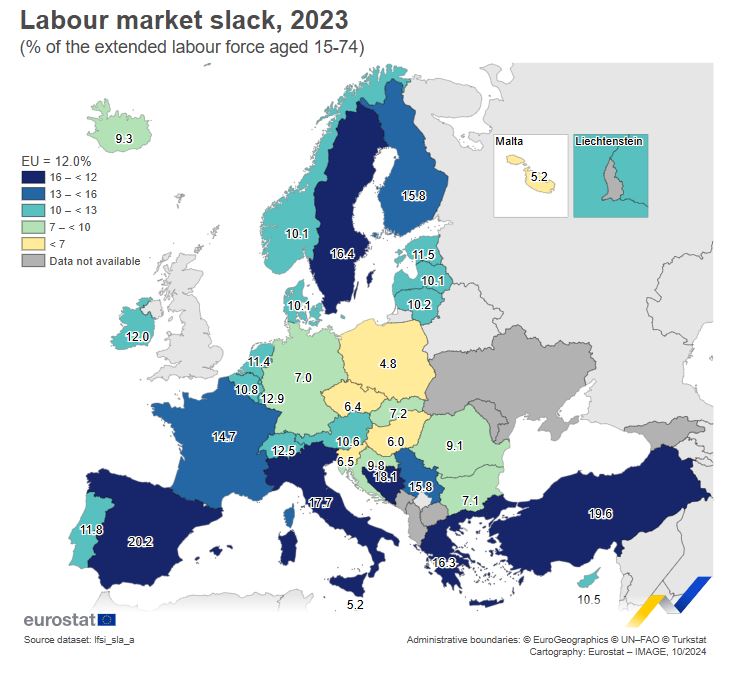 Συνολικά το 2023, το κενό «χαλάρωσης» στην αγορά εργασίας στην Ευρωπαϊκή Ένωση αντιπροσώπευε το 12% του διευρυμένου εργατικού δυναμικού. Αυτό σημαίνει ότι 27,1 εκατομμύρια άτομα ηλικίας 15-74 ετών ήταν σε θέση να προσφέρουν εργασία, αλλά δεν αξιοποιούνταν πλήρως.