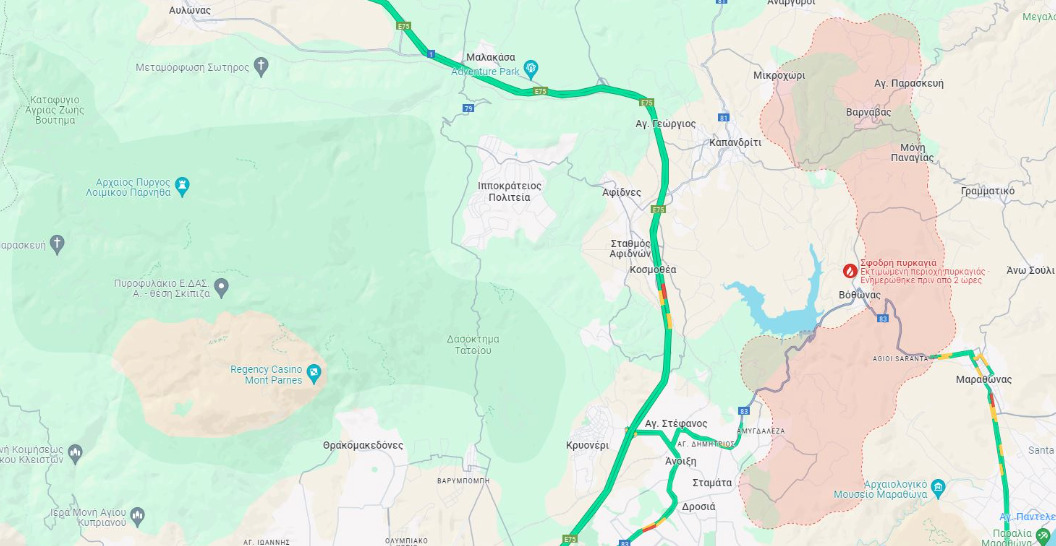 Όπως είπε στο MEGA στις 2.00 μετά τα μεσάνυχτα, η δήμαρχος Διονύσου, Αικατερίνη Μοϊχόσογλου: «Η φωτιά είναι στο ύψος της Ραπεντώσας. Είναι η Πυροσβεστική και τα μηχανήματα του στρατού και προσπαθούν να δουν πού μπορούν να κόψουν τη φωτιά.