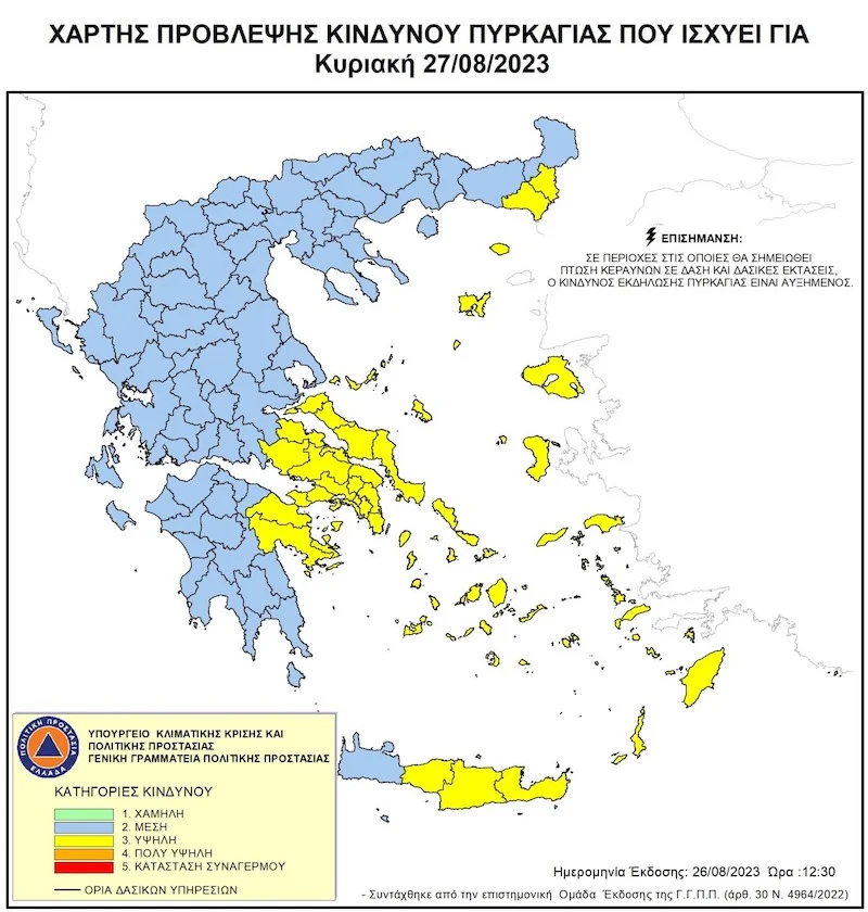Υψηλός κίνδυνος πυρκαγιάς (επιπέδου 3) σχεδόν στη μισή Ελλάδα υπάρχει για σήμερα (27/08), σύμφωνα με τον αντίστοιχο χάρτη πρόβλεψης που εκδίδει η Γενική Γραμματεία Πολιτικής Προστασίας του Υπουργείου Κλιματικής Κρίσης & Πολιτικής Προστασίας.