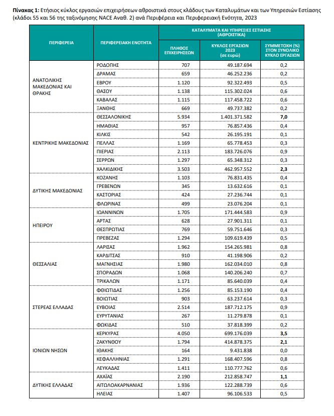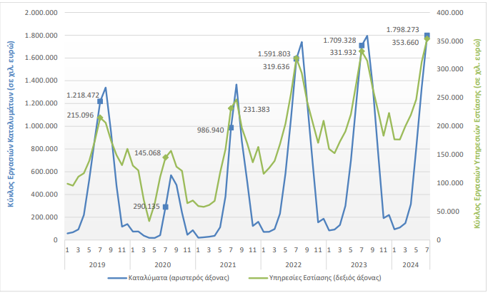 Παράλληλα, για τις επιχειρήσεις στον κλάδο των Υπηρεσιών Εστίασης ο τζίρος τον Ιούλιο ήταν 353,66 εκατ. ευρώ, σημειώνοντας αύξηση 6,5% σε σχέση με τον αντίστοιχο μήνα του 2023, που ήταν 331,93 εκατ. ευρώ.